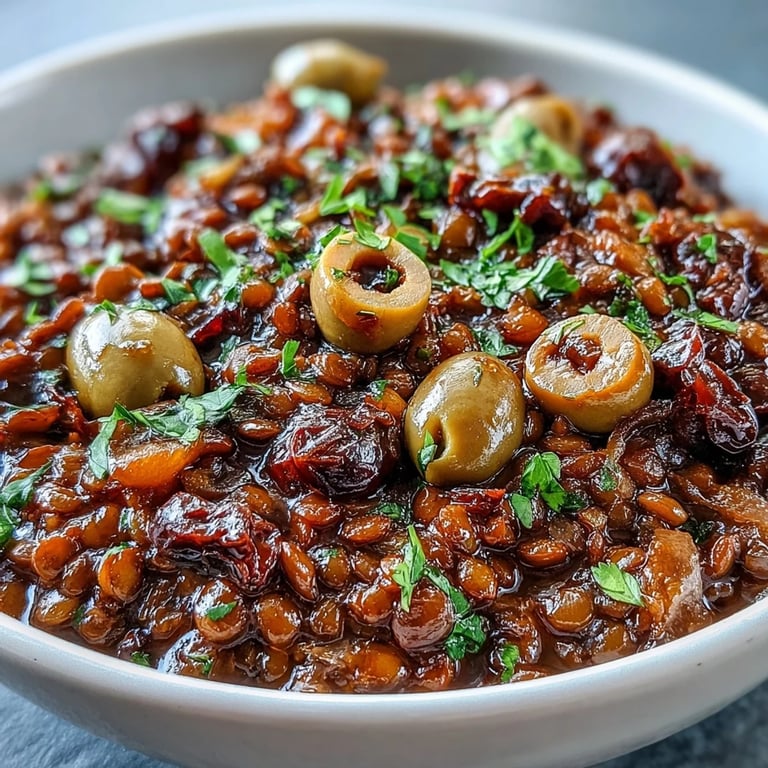 The combination of olives, raisins, and warming spices like cumin and cinnamon reflects the traditional Cuban picadillo flavor profile, while lentils provide a hearty plant-based protein base.