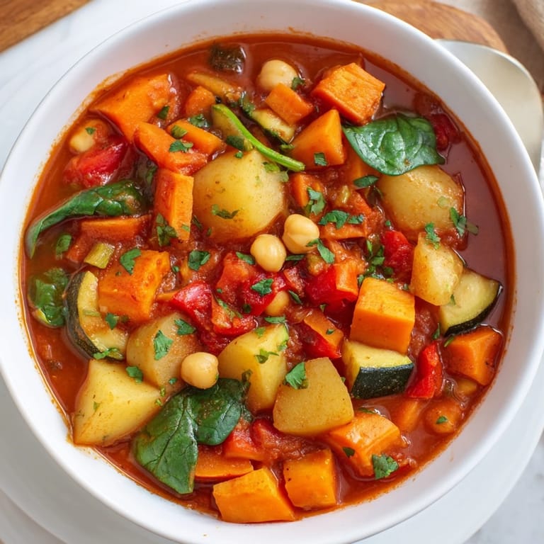 Save to Pinterest There's something about the smell of caramelizing onions that pulls me back to a rainy October afternoon when I decided to stop overthinking dinner and just start chopping vegetables. This stew happened almost by accident—I had sweet potatoes going soft in my pantry, a can of chickpeas I'd been meaning to use, and the kind of mood that needed something warm and uncomplicated. What emerged from that pot was so genuinely nourishing that it's become my go-to when the weather turns or when I need to feel grounded again.